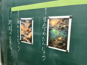 予想を聞いた後、次の内容を板書し、実際にテープ上で位置を示していきます。地球の誕生が46億年前で、3メートルのテープなので1メートルが約15億年、10センチが約1億5000万年年を表すことを伝えます。